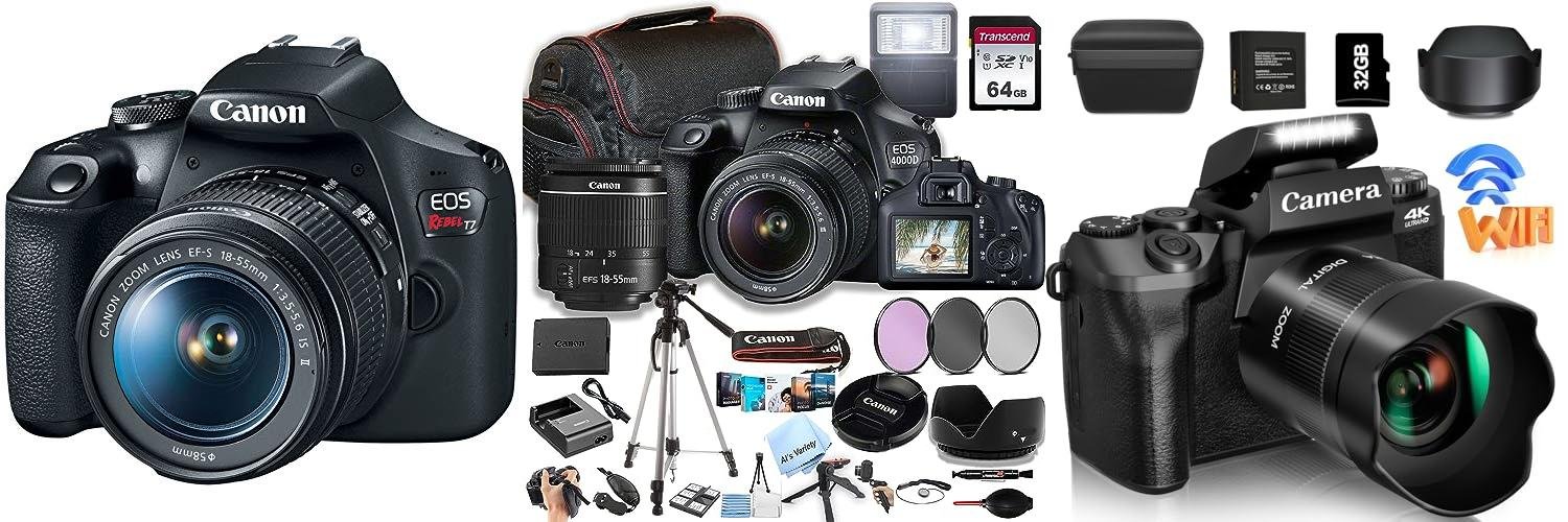 The Canon EOS Rebel T7 is a DSLR camera. It has an 18-55mm lens. It also has built-in Wi-Fi. The camera takes great pictures with its 24.1 MP CMOS sensor. The DIGIC 4+ Image Processor helps with image quality. You can also record videos in Full HD. It is a good choice for beginners.