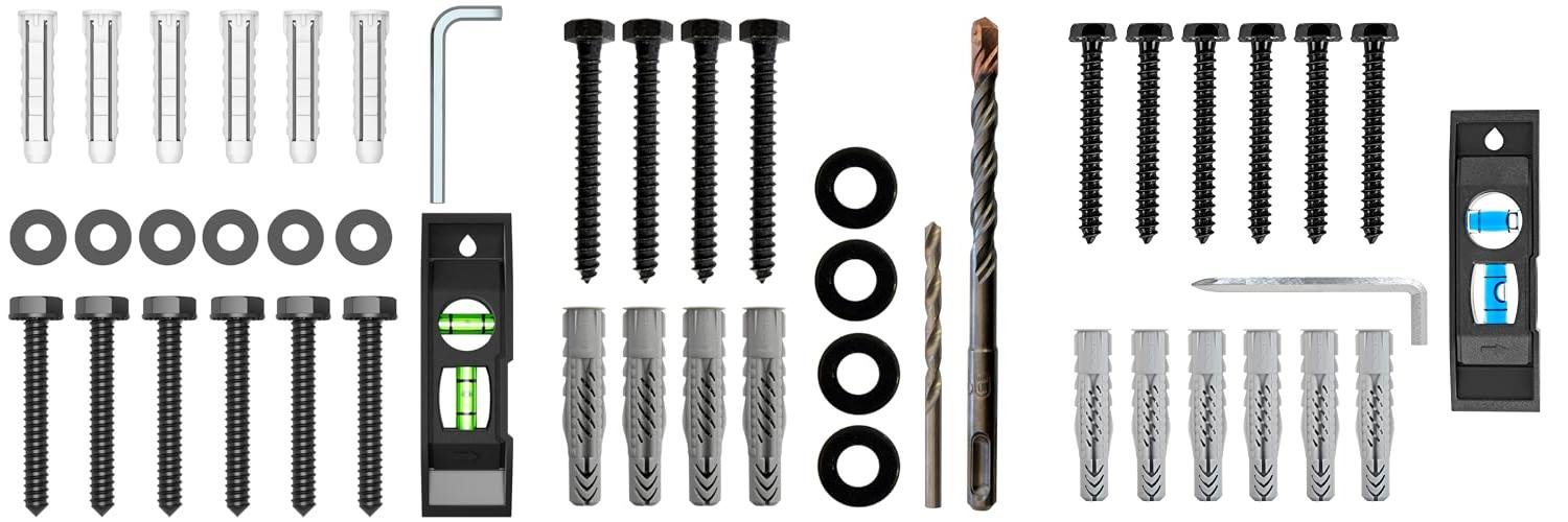 - The kit provides all the necessary parts: 6 M7 lag bolts, 6 washers, 6 anchors, a bubble level, and an Allen key.