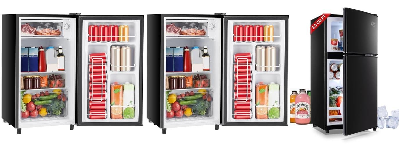 The KRIB BLING 3.5 Cu.Ft Refrigerator with its sleek black finish is a fantastic addition to any small space. This 2-door refrigerator offers both fresh and frozen storage, making it super convenient for keeping all your food and drinks just right. Its compact size means it fits almost anywhere, from your kitchen counter to your dorm room or office. Plus, it comes with handy extras like ice cube trays and spoons to get you started!