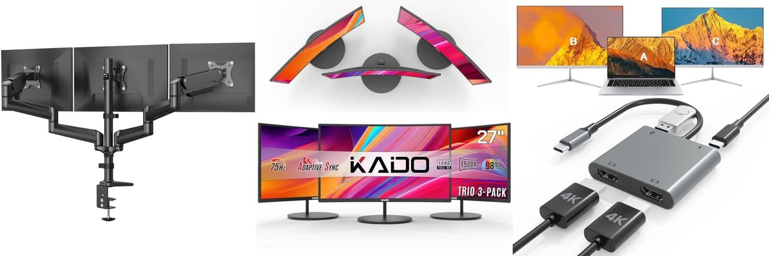 2. Kado Triple Monitor Setup – 3-Pack 27″ Curved 1920×1080 Computer Monitor 1500R 75Hz VESA Mount HDMI Office Gaming Hybrid Built-in Speakers (C27X Trio Series)