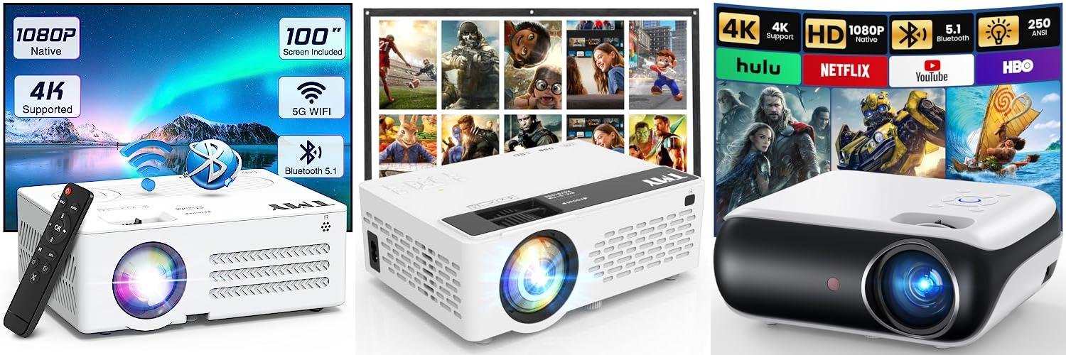 The TMY Projector with WiFi and Bluetooth is a portable projector that includes a 100″ screen. It’s designed for both indoor and outdoor use. This projector supports 4K video and has a native 1080P resolution. You can easily connect your devices with WiFi and Bluetooth. It aims to give you a great home theater experience anywhere.