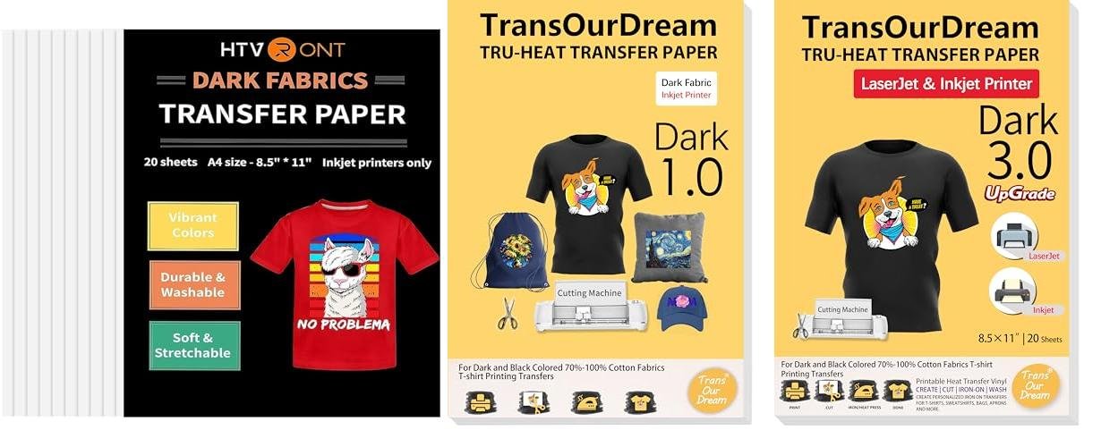TransOurDream Tru-Heat Transfer Paper for Inkjet & Laserjet Printer (20 Sheets, 8.5x11", Dark 3.0) Printable HTV Heat Transfer Vinyl for T Shirts Iron on Transfers for Dark Fabrics (TRANS-D3-20)