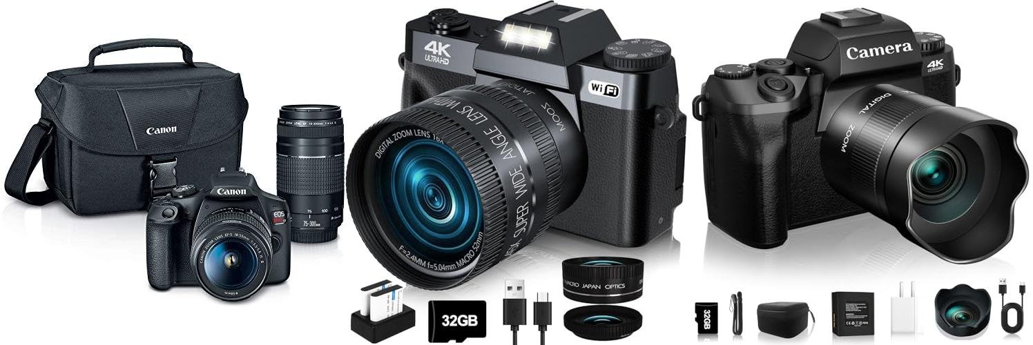 The Canon EOS Rebel T7 DSLR Camera is a great starter camera. This kit comes with two lenses. You get an EF 18-55mm lens and an EF 75-300mm lens. It is a black camera. It helps you take awesome photos and videos. The camera has many cool features like Wi-Fi. You can easily share your photos online. It’s good for beginners who want to learn photography.