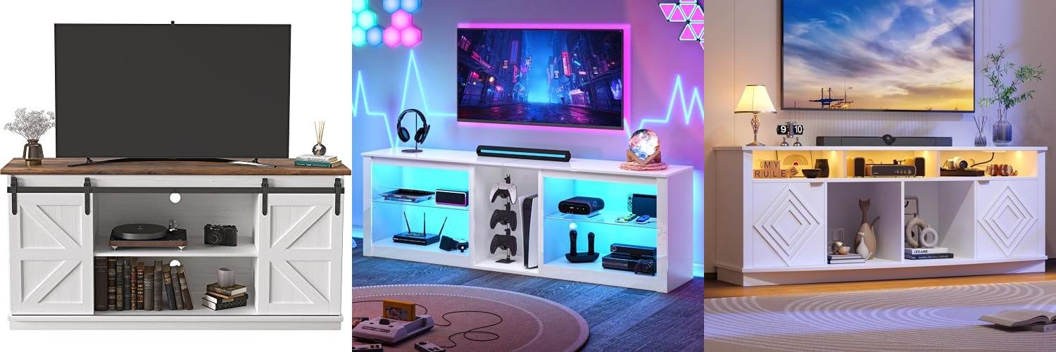 Upgrade your living space with the JUMMICO TV Stand for 65 Inch TV. This entertainment center brings a touch of farmhouse charm to your home while offering practical storage solutions. Its bright white finish and mid-century modern design make it a stylish addition to any living room or bedroom.