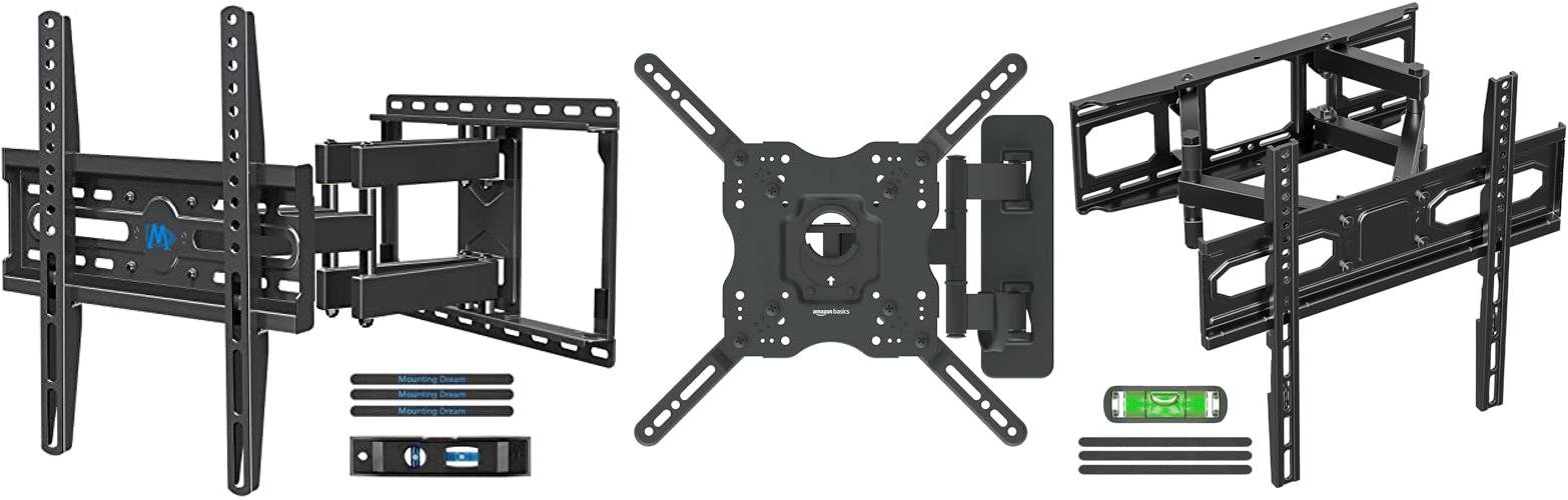 This Amazon Basics TV wall mount lets you put your TV on the wall. It fits TVs from 26 to 55 inches and weighs up to 80 pounds. This mount moves around a lot. You can tilt, swivel, and pull it away from the wall. It is made to work with concrete, brick, and wood stud walls. It also comes with everything you need to put it up, like screws and a level.